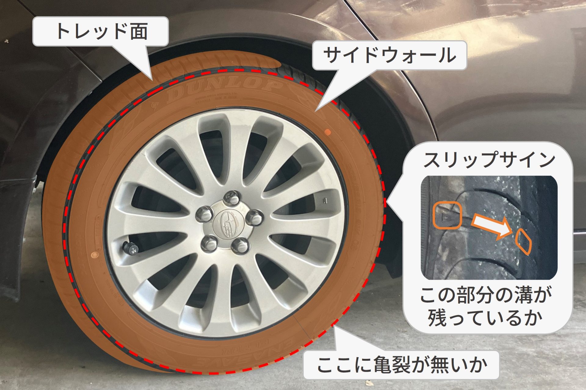 次にサイドウォールに傷や亀裂が無いか、ホイール側面に大きな傷や変形が無いかを確認します。特にサイドウォールとトレッド面との境界(写真の赤い点線部)に円周状のヒビが入っていたら要注意です。名刺などちょっと硬めの紙をヒビの中に差し込んで深さを調べてみましょう。5ミリ以上入ったら危険信号。すぐに修理工場や専門知識を持つ人に相談しましょう。