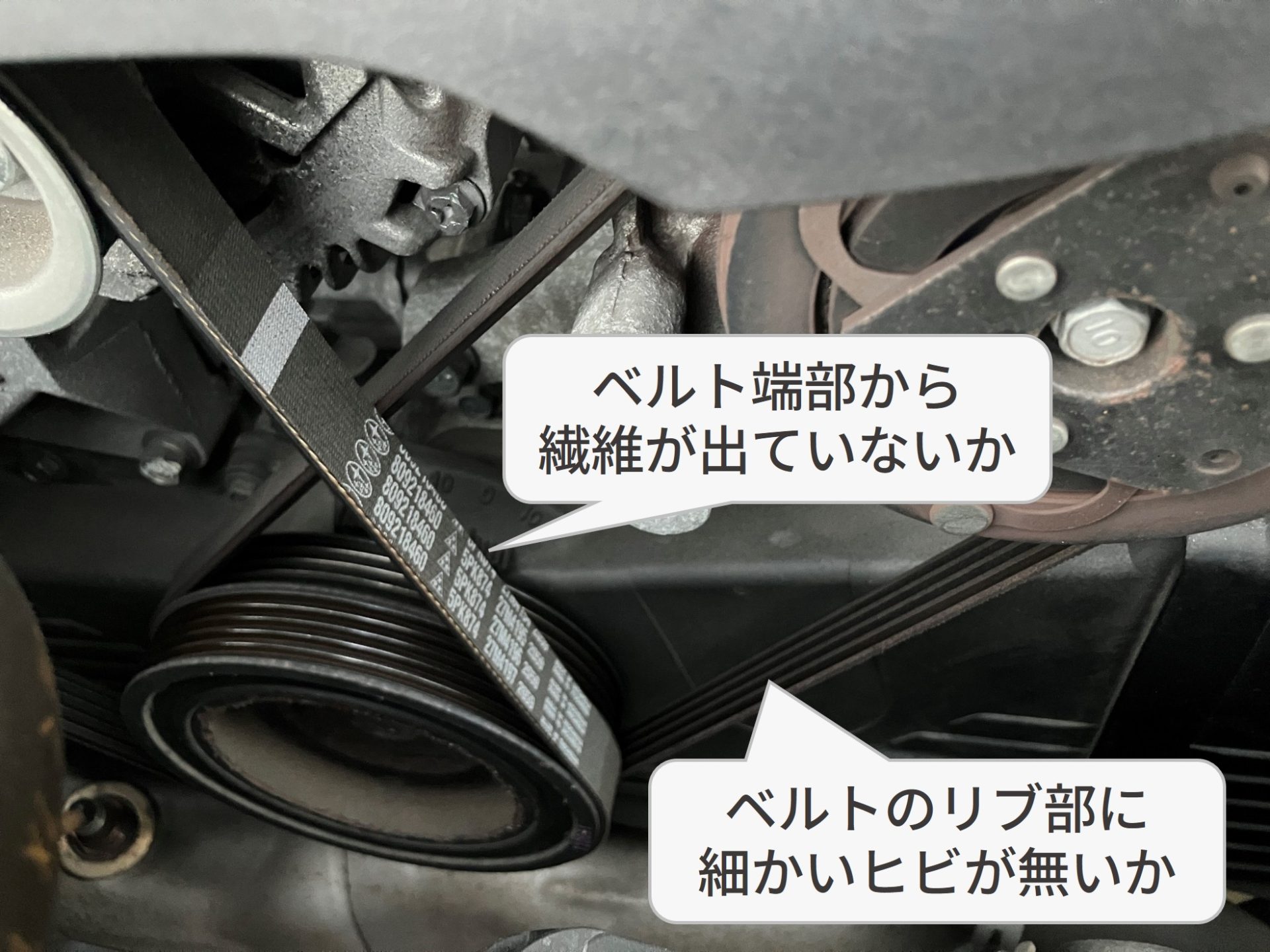 【ひとくちメモ】ベルトの損傷は、ベルトでつながっている機器に不具合の原因がある場合もあります。自己判断せず修理工場や専門知識を持つ人に相談しましょう。