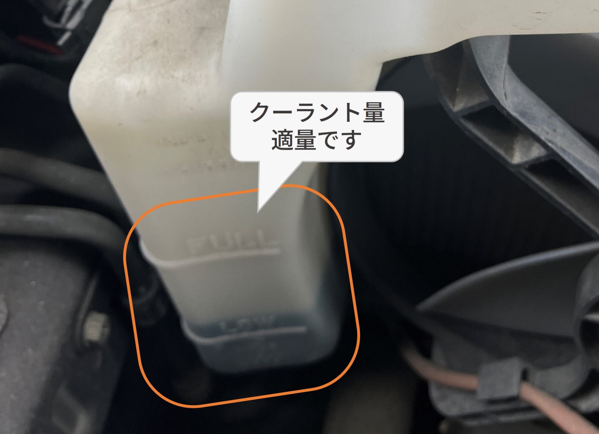 クーラントとは冷却液のことで、氷点下でも凍らない性質のため不凍液と呼ばれたり、長期にわたり性能を発揮するためLLC(ロングライフクーラント)とも呼ばれ、エンジンのオーバーヒートを防ぐ重要な役割を担っています。写真のように液面がFullとLowの間にあればOKです。液面が確認できないほどリザーバタンクが汚れている場合は、リザーバタンクを交換したほうが良いかもしれません。異常が見つかったら自己判断せず修理工場や専門知識を持つ人に相談しましょう。
