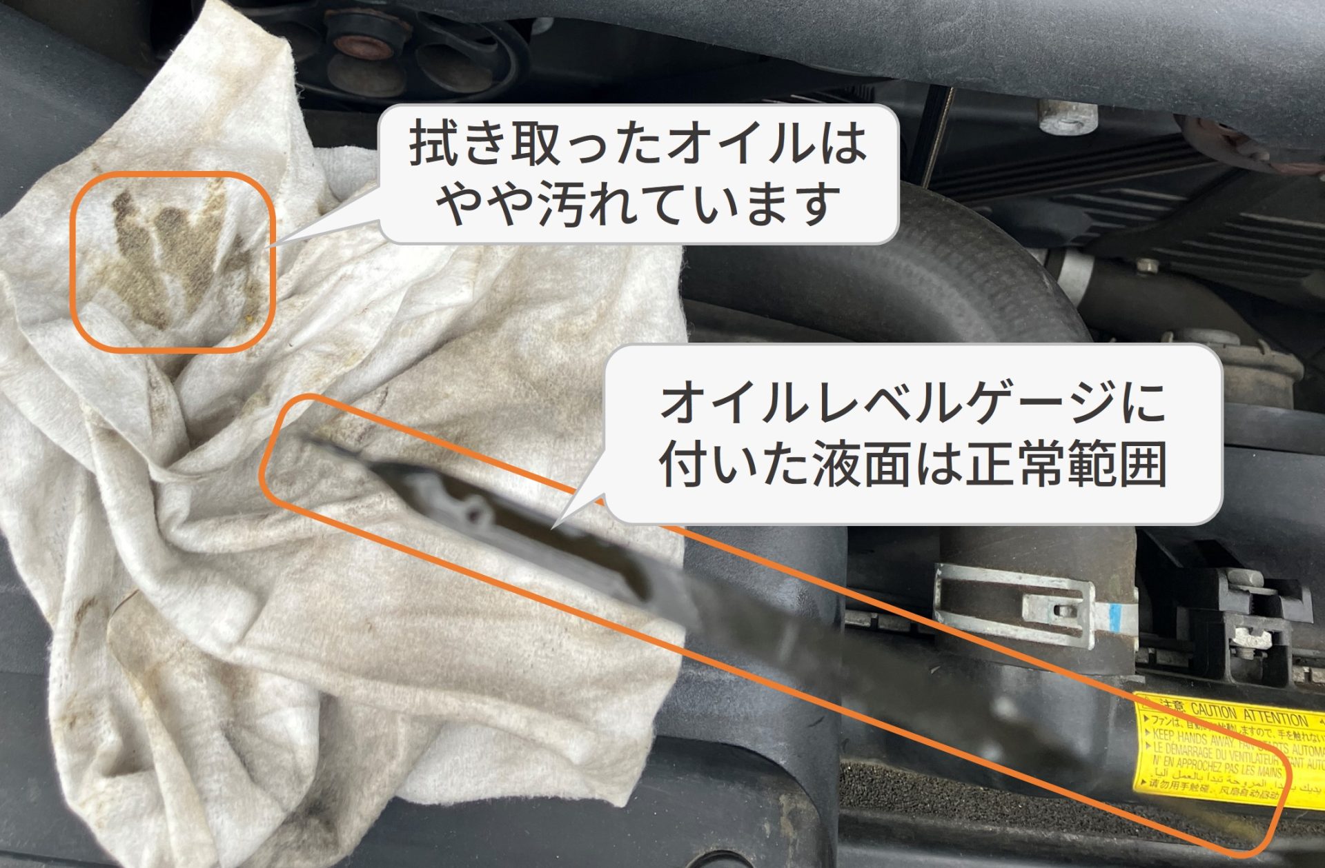 ウエスを用意し、エンジンオイルの量および劣化度合いを確認します。