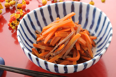 福島県北部に江戸時代末期※1から伝わる「いかにんじん」は、するめいかと人参の千切りを酒・醤油・みりん等で味付けしただけのシンプルな和え物です。大量に作れて保存がきくため、正月料理の箸休めとして、祝祭時の酒のつまみとして地域で長く愛されてきました。