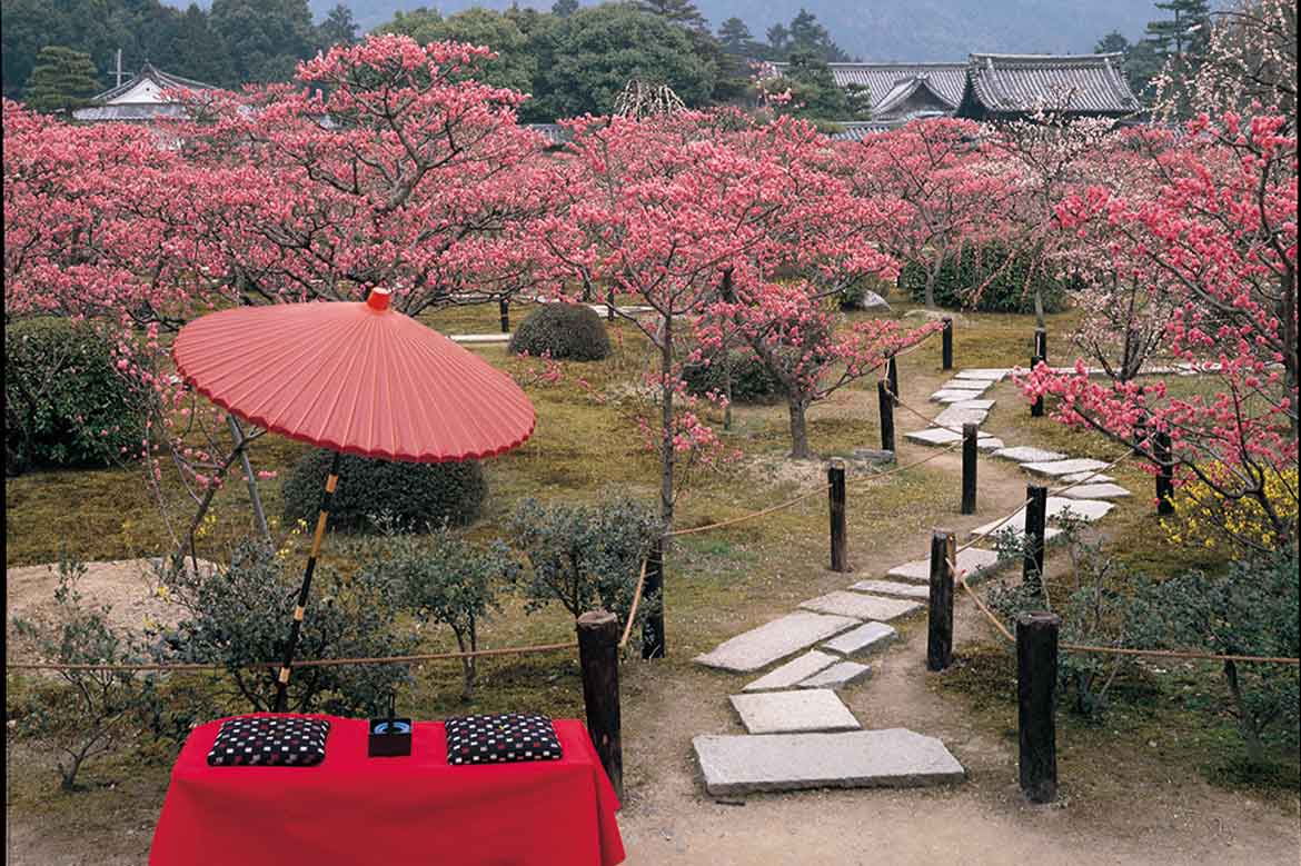 梅園では、山紅梅、白梅、薄紅梅など、春の訪れを告げる様々な種類の梅が咲き誇ります。最も多い薄紅梅の色は古来より「はねずいろ(朱華色)」と呼ばれていたことから、「はねずの梅」として親しまれ、京都市内きっての遅咲きの梅として知られています。そんなはねずの梅をはじめ、約200本の紅梅や白梅が咲き誇る姿を堪能ください。