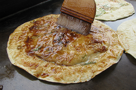 小麦粉を水で溶き、鉄板の上で薄く焼き、ねぎ、肉、卵などを入れ、ソースまたは醤油だれをつけて食べるふわりとしたお好み焼きのようなもの。安くて持ち運びが便利なうえに腹持ちがよく、昭和初期には足袋工場で働く女工さんの間で人気となり、販売する店が増えて定着したと言われています。