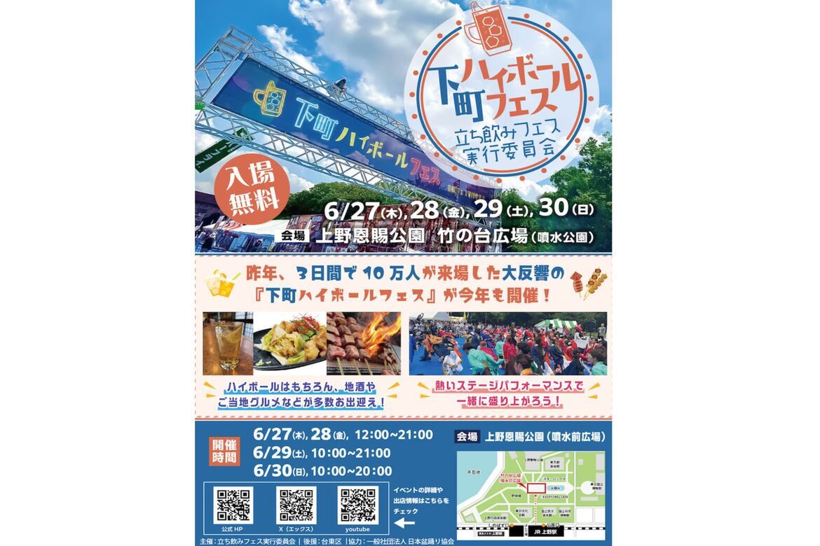オリジナルハイボール・クラフトビールなどを立ち飲みスタイルで楽しめる、イベント・立ち飲みフェス実行委員会が主催する「下町ハイボールフェス2024」が、東京都台東区にある「上野恩賜公園(噴水前広場)」にて、2024年6月27日(木)〜30日(日)の期間で開催されます。