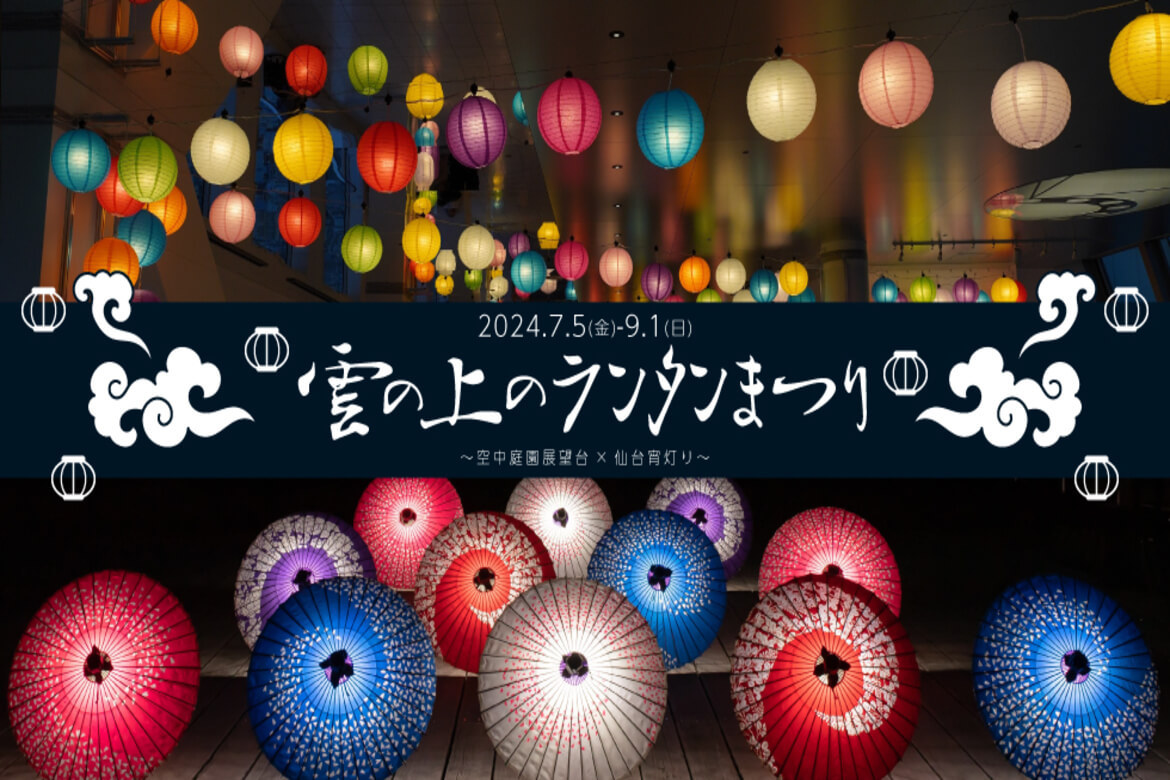「梅田スカイビル 空中庭園展望台」の40F屋内展望フロアにて、色とりどりのランタンと光る和傘で和の灯りを演出する「〜 雲の上のランタンまつり×仙台宵灯り ~」が、2024年7月5日(金)〜9月1日(日)の期間で開催されます。