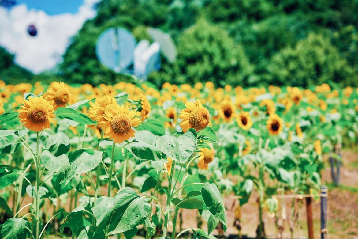 “きっと忘れない夏”をテーマにした夏のロケーションが楽しめるひまわり畑では、昼は元気いっぱいに、夕方は夕日に照らされ幻想的に、朝・昼・夕と時間の経過とともに表情を変えるひまわりが美しく咲き誇り、品種の違うひまわりを植栽しているので長い期間ひまわり観賞を楽しむことができます。