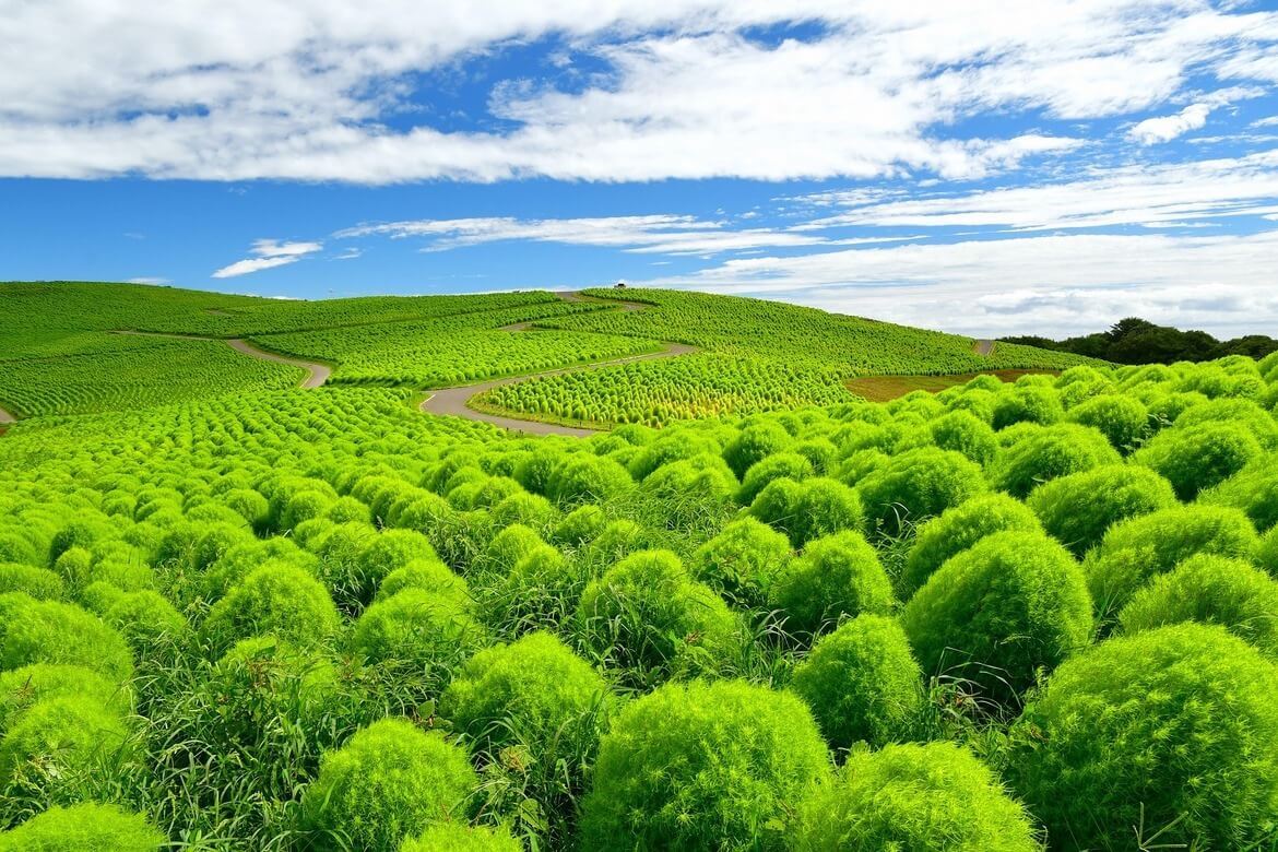 茨城県ひたちなか市にある「国営ひたち海浜公園」の「みはらしの丘」にて、昨年より約7千本多い約4万本のコキアが見頃を迎えています。現在は、50~60cmほどの大きさで順調に生育しており、8月末には70cmほどになる見込み。