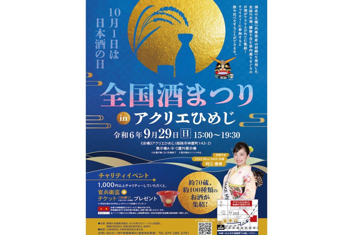 兵庫県姫路市にある「アクリエひめじ展示場」にて、兵庫県産山田錦を使った全国の日本酒と兵庫県播磨地域を含む県内の日本酒が一堂に会する「全国酒まつりinアクリエひめじ」が、2024年9月29日(日)に開催されます。