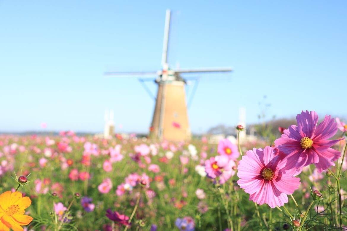 オランダ風車を背景に辺り一面に広がるコスモス。特に快晴の日には、青空と相まって絶景が広がります。昼間に見るのも爽やかでいいですが、印旛沼に沈みゆく夕陽とともに見る景色は圧巻で、絶好のフォトスポットとしても人気です。