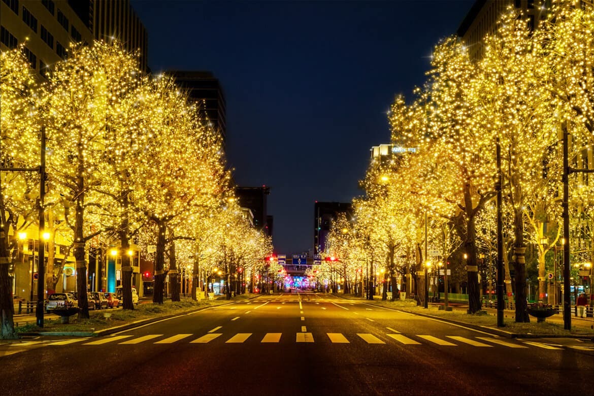 大阪のシンボルストリート御堂筋。梅田から難波までの全長約4kmがイルミネーションできらめきます。今年は、2025年大阪・関西万博機運醸成コンテンツとして、梅田吸気塔となんば広場の万博カラーライトアップを行うほか、北御堂でのワークショップやプロジェクションマッピングなども実施されます。