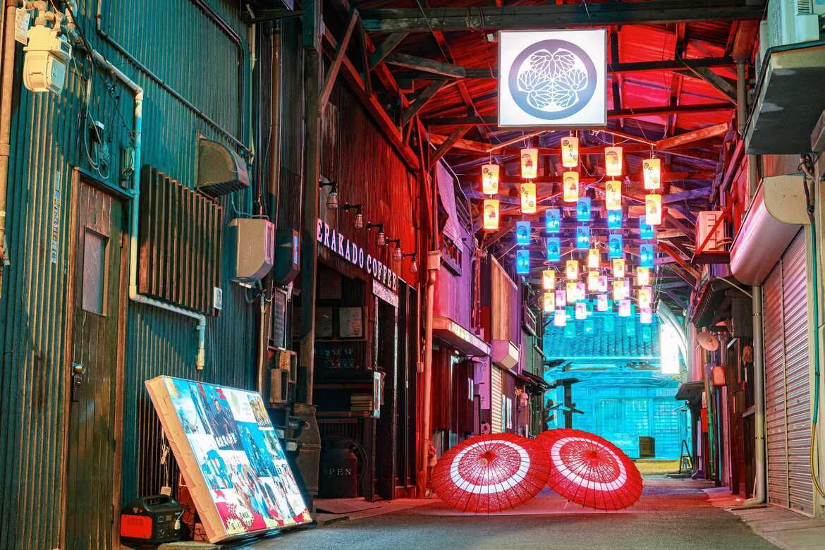 道中:LED オブジェクトや和傘を使用したフォトスポットの設置
