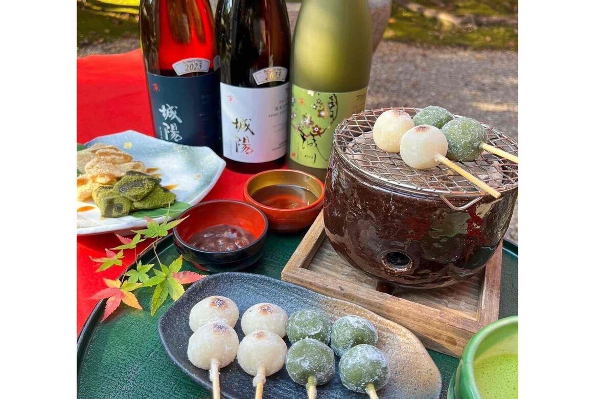 eXcafeブランドとして初の試みとなる地酒の提供は、海外からのお客様のリクエストがきっかけで始まったもの。京都ひいては日本を好きになってほしいとの想いから、七輪の上で自身でお団子を焼き、焼きたてをあずきとみたらしで楽しむ看板商品「ほくほく、お団子セット」をはじめ、同店の和スイーツに合う国際利酒師によって選び抜かれた3種のお酒を用意し、スイーツとお酒のコラボレーションが楽しめます。