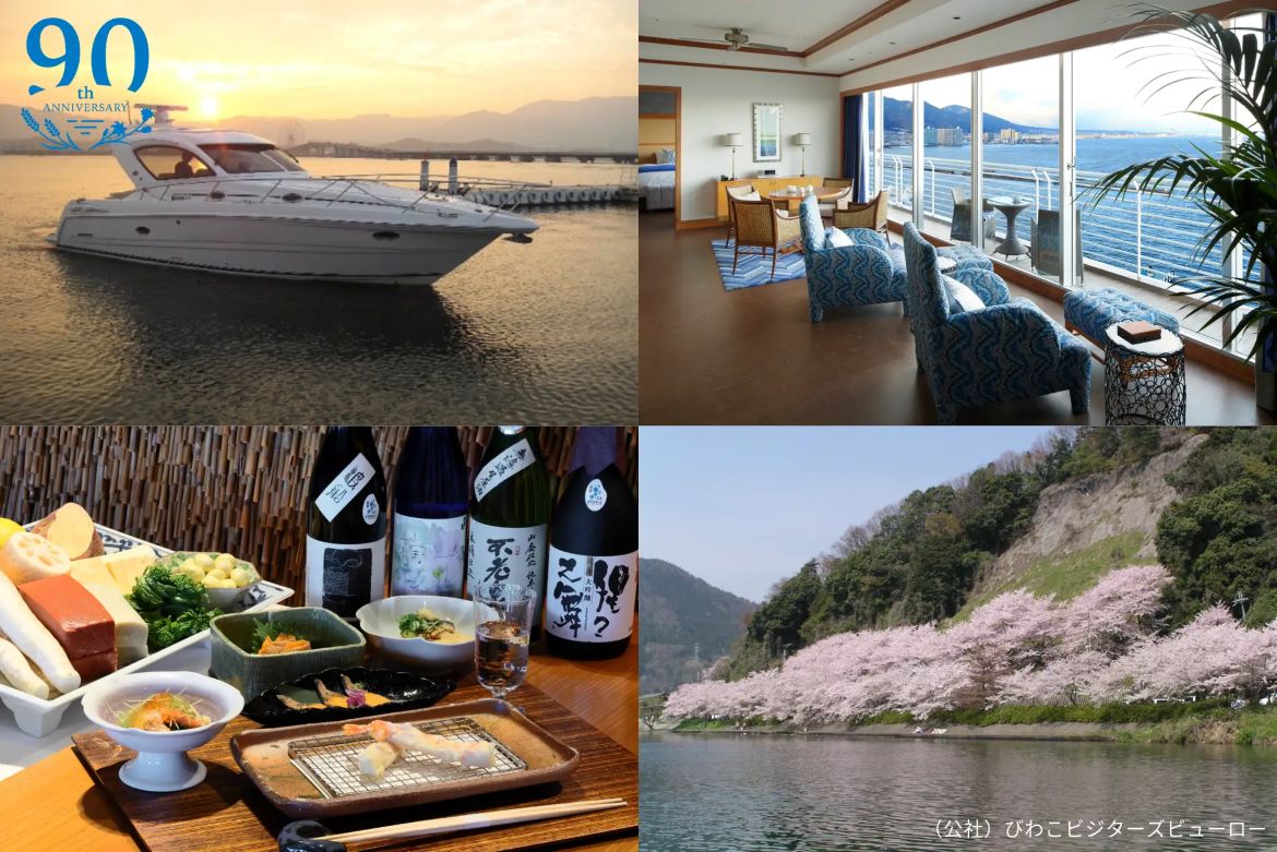 琵琶湖ホテルが、開業90周年を記念し、ロイヤルスイートルームの宿泊と海津大崎の桜鑑賞を貸し切りクルーザーで楽しめる特別宿泊プランの予約販売を開始しました。