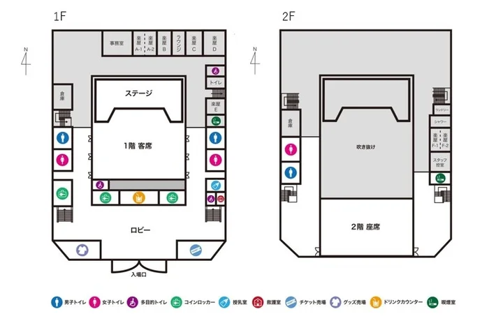 楽屋   :1F…A(2分割可)、B、C、D、E 5室及びラウンジ1室/2F…F(2分割可)
