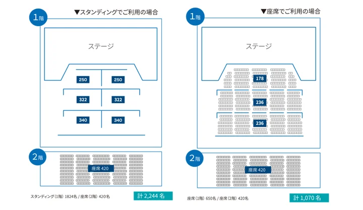 収容人数 :スタンディング使用時 2,244名/座席使用時 1,070名