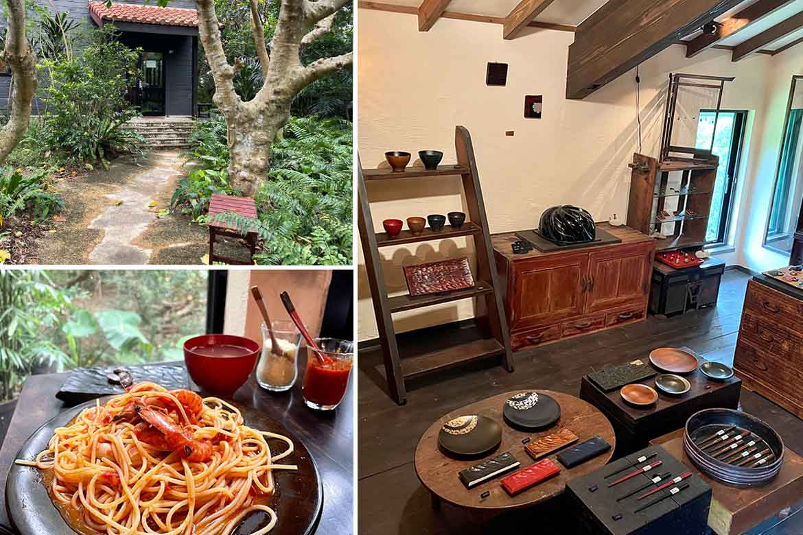 さぁ島の北部、緑に包まれた野底地区へ参りましょう。ここに一軒の隠れ家的なレストランがあります。周囲の静けさと庭のガジュマルの木に惹かれこの地を選んだという、宇野さんご夫妻による「Forestale Uno」です。シェフのご主人が作る島の恵みたっぷりの多彩なパスタ(写真は石垣産車海老の魚介トマトソーススパゲティ)を、塗り師である奥さまの漆器でいただきます。漆器と合わせることで、料理の味や香りが長続きするなど色々な発見があったとご主人。2階のギャラリー「宇野大王丸」には、センスの良い漆器やアクセサリーが並びます。職人の手で丹念に作られる漆器は一生ものです。食後にゆっくりご堪能あれ。