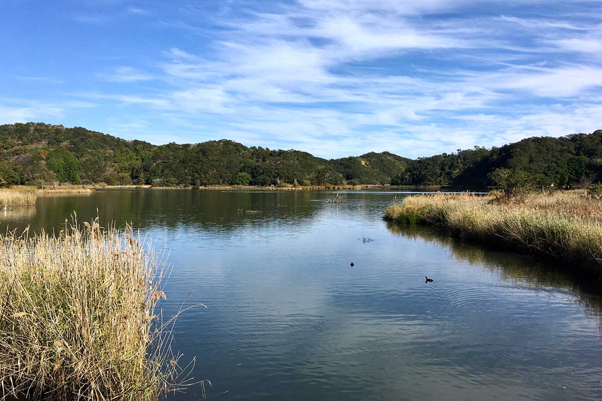 南阿波サンラインを走り切り、国道55号線をしばらく南下すると見えてくる高く伸びたヤシの木たち。ドライバーたちを南国情緒満点で迎えてくれるのが「まぜのおかオートキャンプ場」です。「まぜ」とは徳島の言葉で「南風」という意味。その名の通り、南からの海風が心地よく通る丘の上にあるキャンプ場で、キャンプサイトのほか、BBQ場やコテージもあり、バイカーから家族連れまで、多くのアウトドア好きに人気です。キャンプ場のすぐ隣には、四国唯一の自然にできた湖「海老々池(えびがいけ)」と広々とした芝生が気持ち良い「ピクニック広場」があります。海老々池は周囲約4km。散歩コースも整備されているので、朝のお散歩などにぴったりです。バードウォッチングのメッカでもあるので、途中の休憩小屋でゆっくり休みながら、のんびり四国の大自然を味わってみてはいかがでしょうか。