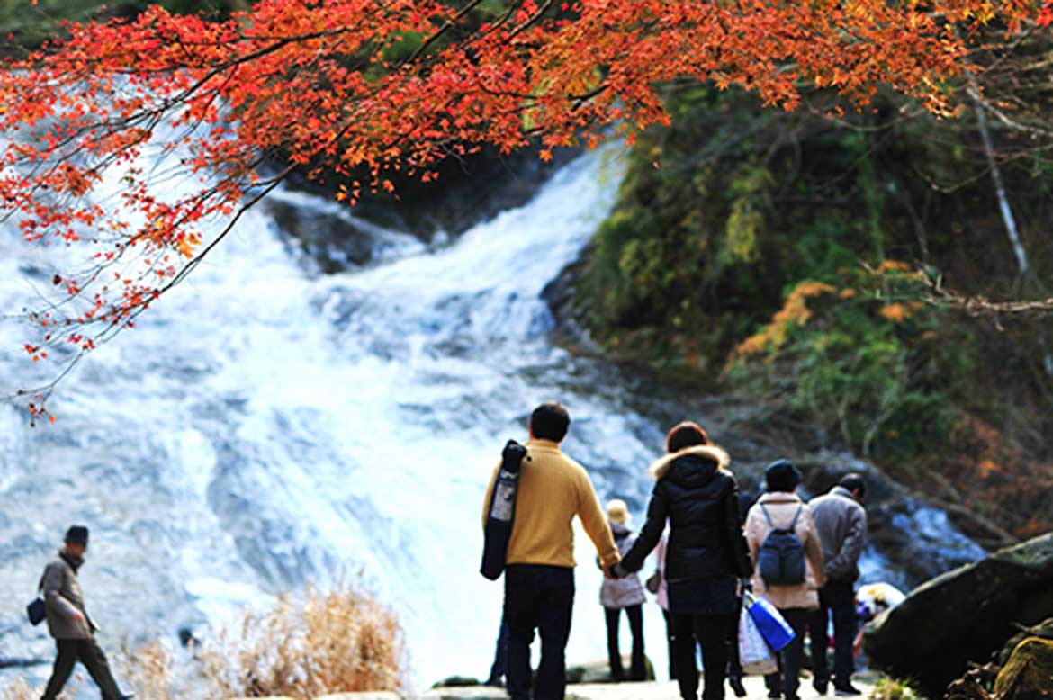 房総の奥座敷とも呼ばれ、養老川の上流沿いに位置する渓谷で、豊かな自然と房総一の滝、房総最大の温泉郷を擁しています。中でも、県内有数の紅葉の名所として名高い粟又の滝は一見の価値あり。全長約100mほどの緩やかな滝で、その岩肌を流れ落ちる様子は美しく幻想的。そして、秋が深まる頃には自然豊かな渓谷は紅葉に彩られ、より一層の美しさが堪能できるでしょう。紅葉の見頃は、11月下旬から12月上旬。約2kmの遊歩道が整備されているので、途中点在する大小の滝にパワーをもらいながら、大自然の中のハイキングにもおすすめです。
