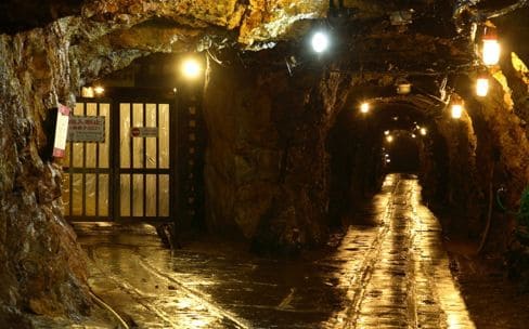 主に銅が産出された鉱山で昭和53年に閉山した尾去沢鉱山(おさりざわこうざん)は、全長800km。見学用の観光坑道内(全長約1.7km)は1週40分ほどのコースで歩いて見学をすることができる。採掘現場など当時の作業員の様子は人形を使ってリアルに再現。夏でも寒いくらいの気温で保たれている。砂金採りの体験もできる。坑道観覧料/大人1000円。