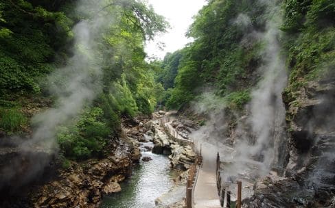 皆瀬川の急流が長年にわたり両岸を深く浸食してきた小安峡谷(おやすきょうたに)。高さ約60mの断崖の裂け目から約98度の熱湯が轟音とともに噴き出す。岩づたいの階段を降りると、その先には遊歩道が続きシューッと熱湯と蒸気が激しく噴出す小安峡大噴湯が。秋は紅葉、春は新緑の絶景ポイントに。冬は渓谷に下がる大きなつらら「しがっこ」を楽しめる。