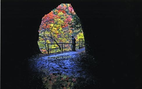 訪れる人々を魅了する「抱返り渓谷」(だきがえりけいこく)。両岸の原生林と岸壁にかかる滝や独特の青い渓流が美しく、新緑と紅葉の名所でもある。渓谷の名の由来は諸説あり、人がすれ違う時にお互い抱きかかえるような、狭く険しい山道だったことから「抱返り」と呼ばれるようになったとか。「神の岩橋」と呼ばれる赤い吊り橋からの眺望も素晴らしい。