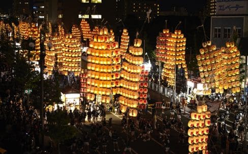 毎年8月上旬に行われる竿燈(かんとう)まつり。提灯を揺らめかせ、稲穂に見立てた竿燈を操りながら力と技を競う。由来は諸説あり、真夏の病魔や邪気を払う、ねぶり流し行事として宝暦年間にはその原型となるものができていたといわれる。厄よけやみそぎをして五穀豊穣を祈る行事として、279年以上に渡って庶民のあいだに受け継がれている。