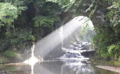 350年程前、山間を南房総方面に向けて道路の整備をする際に、川廻しの工事が行われたときに削られた岩盤の高低差が滝になったといわれる、濃溝の滝(のうみぞのたき)。昔は秘境とも言われたが、今は遊歩道も整備され手軽に訪れることができるように。洞窟の中と外の明暗差が美しさを際立たせ、幻想世界のような写真がインスタグラムでも話題に。透き通る水にため息が出る。