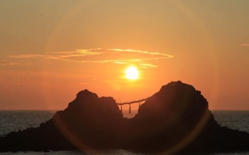 夕日の二見ケ浦とも呼ばれ、県指定の名勝で「日本の渚百選」「日本の夕日百選」に選ばれている。海岸から約150mの海中に屹立する夫婦岩は、毎年5月の大潮の干潮を期して長さ30m、重さ1tの大注連縄(おおしめなわ)で結ばれ、仲良く並んでいる。古くは竜宮の入口として親しまれていたそう。夏至の頃、夫婦岩の間に沈む夕陽の景観が美しい。