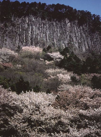 屏風岩(高さ868m)は兜岳の西側にあり、その奇峯が名前の通り、まるで屏風を立てたように切り立っている。幅2kmにも渡りノコギリの刃のように鋭くそびえ、垂直に柱状節理の岩壁が約200mの断壁を成す。岩壁にはミツバツツジなどが咲き誇り、山麓に広がる公苑は春には大木の山桜が咲き乱れ、秋には紅葉で彩られる岩壁とのコントラストは圧巻だ。国の天然記念物に指定。