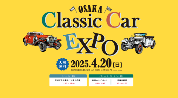 1970年大阪万博跡地である「万博記念公園」をメイン会場に、希少なクラシックカー約50台と最先端モビリティが一堂に会する大型イベント。ステージパフォーマンス、縁日、グルメなど家族で楽しめるコンテンツも充実。