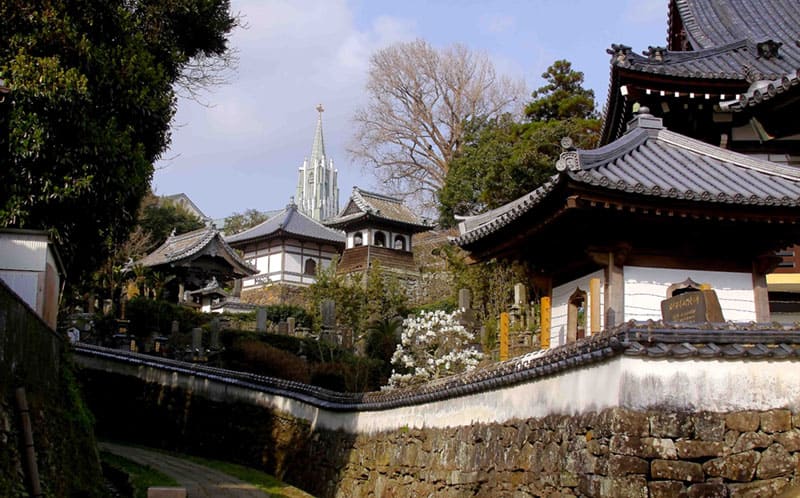 日本の陸路最西端に位置する平戸市は、日本初の西洋貿易港で西洋文化の窓口として栄えた場所。平戸城をはじめとする歴史的建造物や14ものカトリック教会が共存しており、平戸独特の風景を楽しんでもらいたい。特に平戸ザビエル教会と光明寺、瑞雲寺が交差して見える平戸の代表的な「寺院と教会が見える風景」は、日本と西洋の文化が共存している珍しくも美しい風景だ。