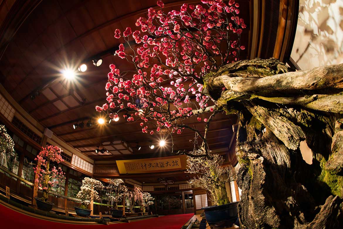 盆梅(ぼんばい)とは梅の盆栽のことで、約90鉢の盆梅が常時展示されます。中には、高さ3m近い巨木や樹齢400年と伝わる古木もあり、見ごたえ抜群。期間中は入れ替えを行いながら、つぼみから満開までさまざまな咲き具合の盆梅が堪能できます。