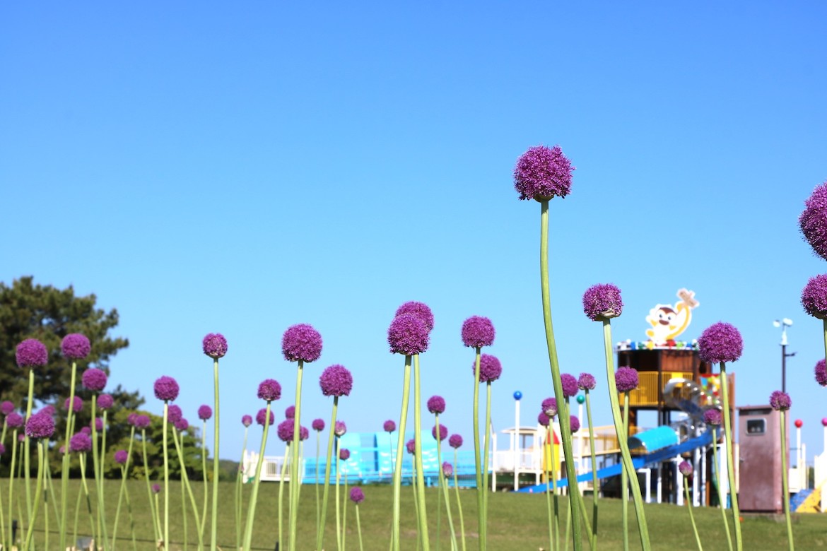 博多湾と玄界灘の2つの海に囲まれた砂州状の地形「海の中道」に位置する「国営海の中道海浜公園」内の彩りの花壇にて、紫色の丸い花が特徴的な約1,000本の「アリウム・ギガンチウム」が見頃を迎えています。