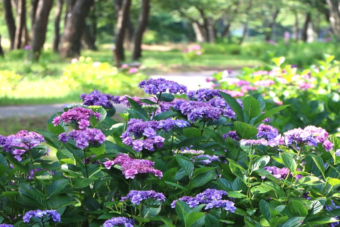 福岡県福岡市、博多湾と玄界灘の2つの海に囲まれた砂州状の地形に位置する「国営海の中道海浜公園」にて、30品種2,000株のアジサイが見頃を迎えています。