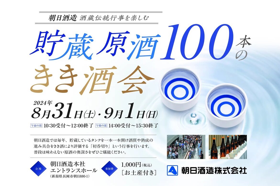 新潟県長岡市にある朝日酒造株式会社の「朝日酒造本社エントランスホール」にて、原酒の奥深さを味わうことができる「貯蔵原酒100本のきき酒会」が、2024年8月31日(土)・9月1日(日)の2日間限定で開催されます。