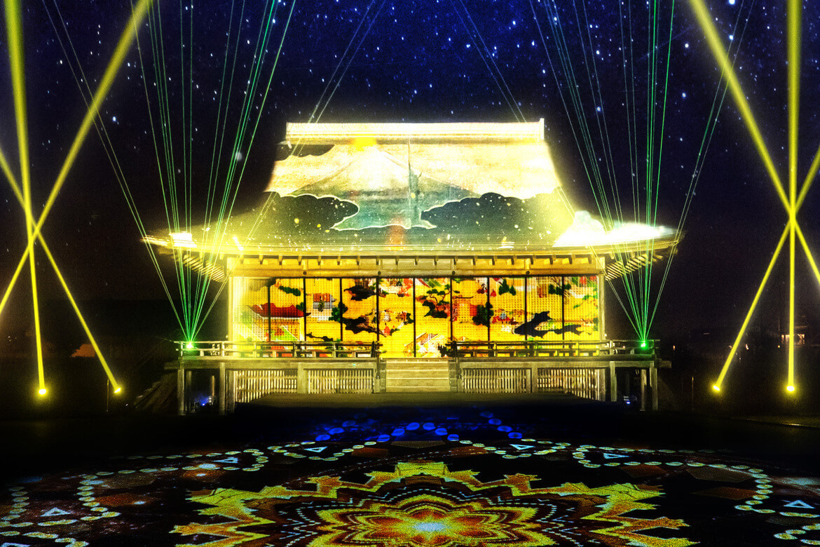 西脇殿・正殿・東脇殿の3つの建物の総称「さいくう平安の杜」を舞台に、投影されるプロジェクションマッピング映像は、斎宮歴史博物館協力のもと「斎王群行絵巻」「伊勢物語図屏風」「源氏物語絵巻」「源氏物語色紙貼交屏風」「十二単」など、斎宮ゆかりの文化芸術をモチーフしたもの。普段は日中のみの公開のため、同イベント限定で夜間の「さいくう平安の杜」が楽しめる貴重な機会です。