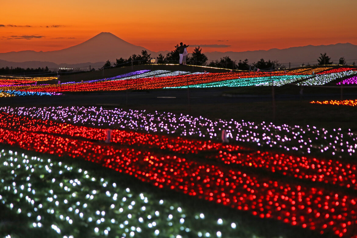 標高約300mの山頂に位置し、東京湾を望む立地のマザー牧場だから見ることができる景色とイルミネーションのコラボレーションが特徴。夕方は夕陽に輝くオレンジの景色、日没後~40分間のマジックアワーでは、空のグラデーションが美しい景色、夜は東京湾の夜景を一望するロマンチックな景色など、時間と共に移り変わる景色と色鮮やかなイルミネーションとのコラボレーションをお楽しみください。天気が良い日には、富士山のシルエットが浮かぶ夕景が見られるチャンスも。