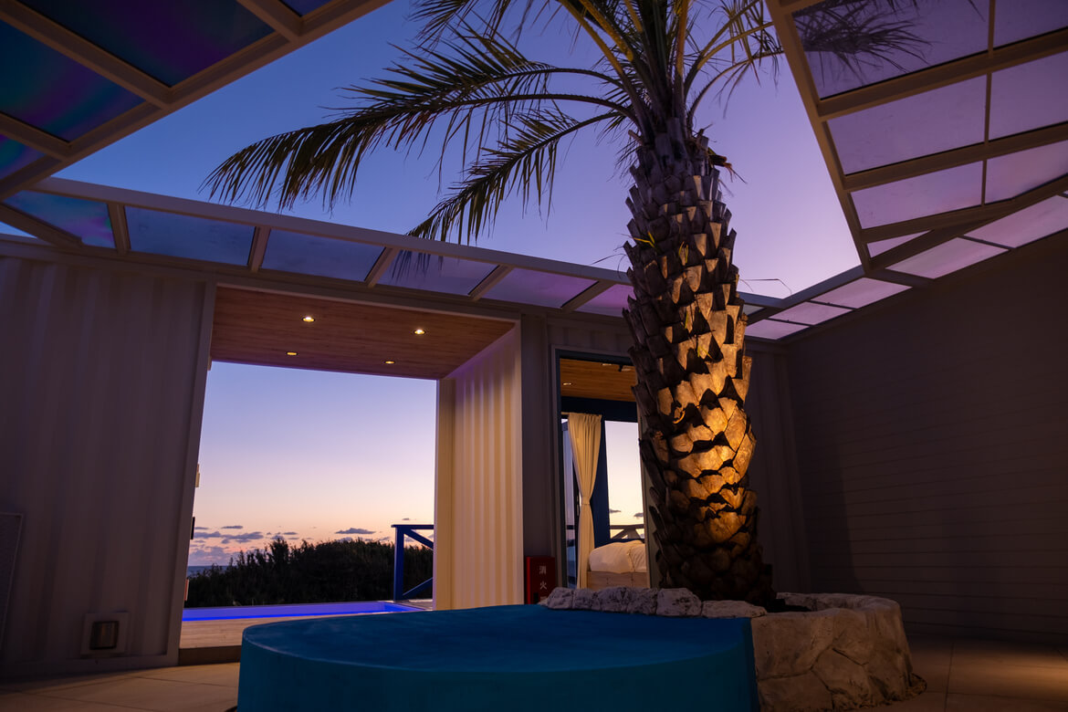 今回新たにオープンした「UMInoTERRACE Hanare」は、コンテナを組み合わせて生み出された、3棟あるUMInoTERRACEシリーズの中でも最もプライベート性とリラクゼーションに特化した施設です。遮るものが何もない絶景オーシャンビューの客室や寝室、サウナや温水プールも完備されており、海を眺めながら都会の喧騒を忘れ、心からリラックスできる唯一無二の時間と体験を満喫ください。