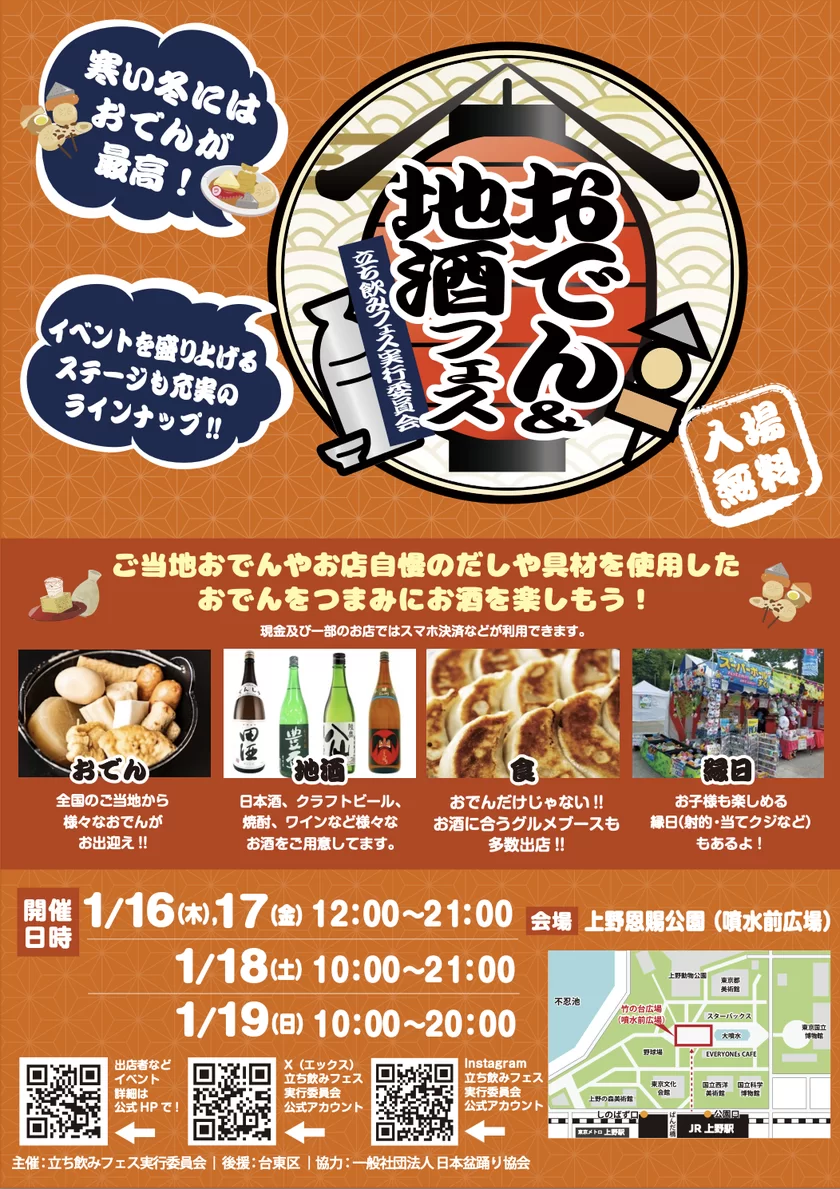 東京・上野恩賜公園 竹の台広場(噴水前広場)で2025年1月16日(木)~19日(日)の4日間『おでん&地酒フェス2025』を開催することをお知らせいたします。本企画は、日本各地にある『ローカルなお酒と様々なコトを掛け合わせる』×『立ち飲みという人と人の距離を縮めるスタイル』で、東京を拠点に全国各地で立ち飲みイベントを開催し、色々な縁を繋いでいくイベントとなっております!