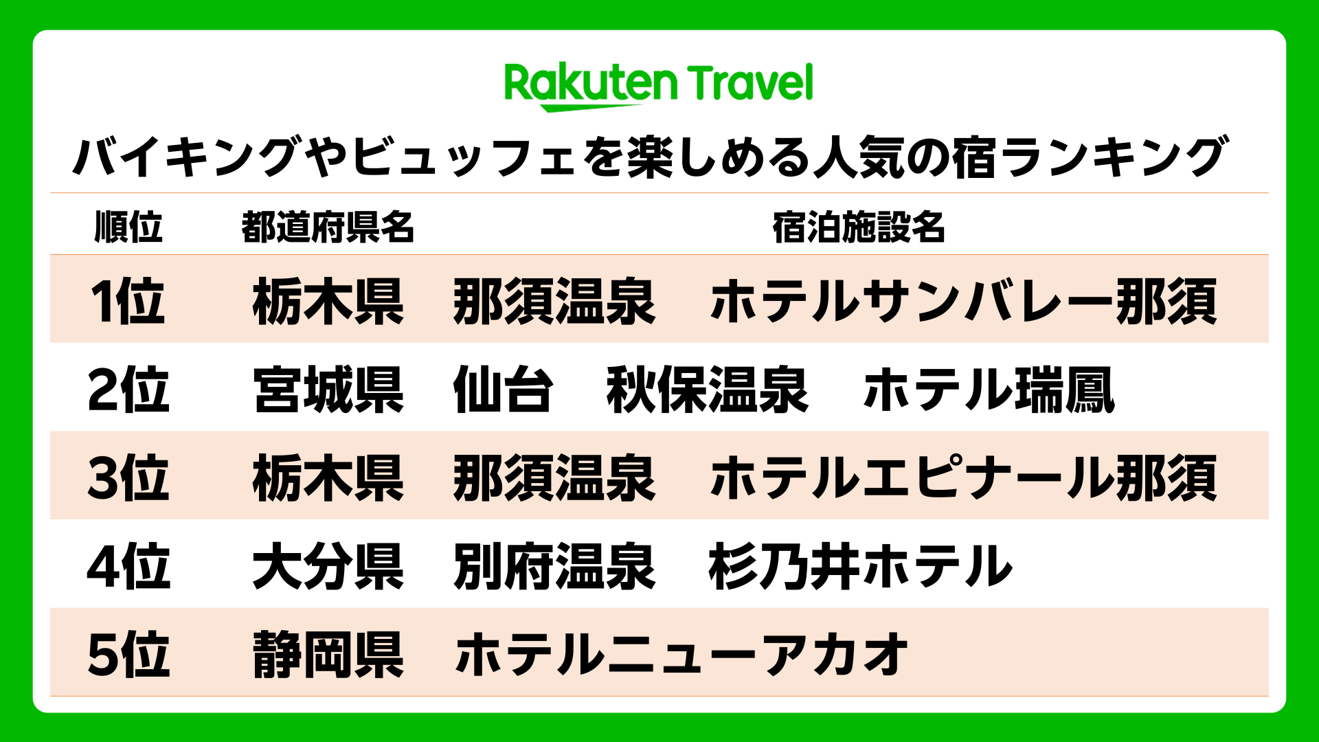 こうした傾向を受け、「楽天トラベル」では、登録されている全国のシティホテルとレジャーホテルを対象に、2024年5月~2025年4月の1年間における「バイキング」「ビュッフェ」プランの宿泊施設ランキングを算出しました。その結果、1位は栃木県の「那須温泉 ホテルサンバレー那須」となりました。トップ5の宿泊施設には、注文を受けてから料理を仕上げるライブキッチンに対応し、豪華な食事や、旬の食材や地元の素材を使用した種類豊富なメニューを味わえるという傾向がみられました。