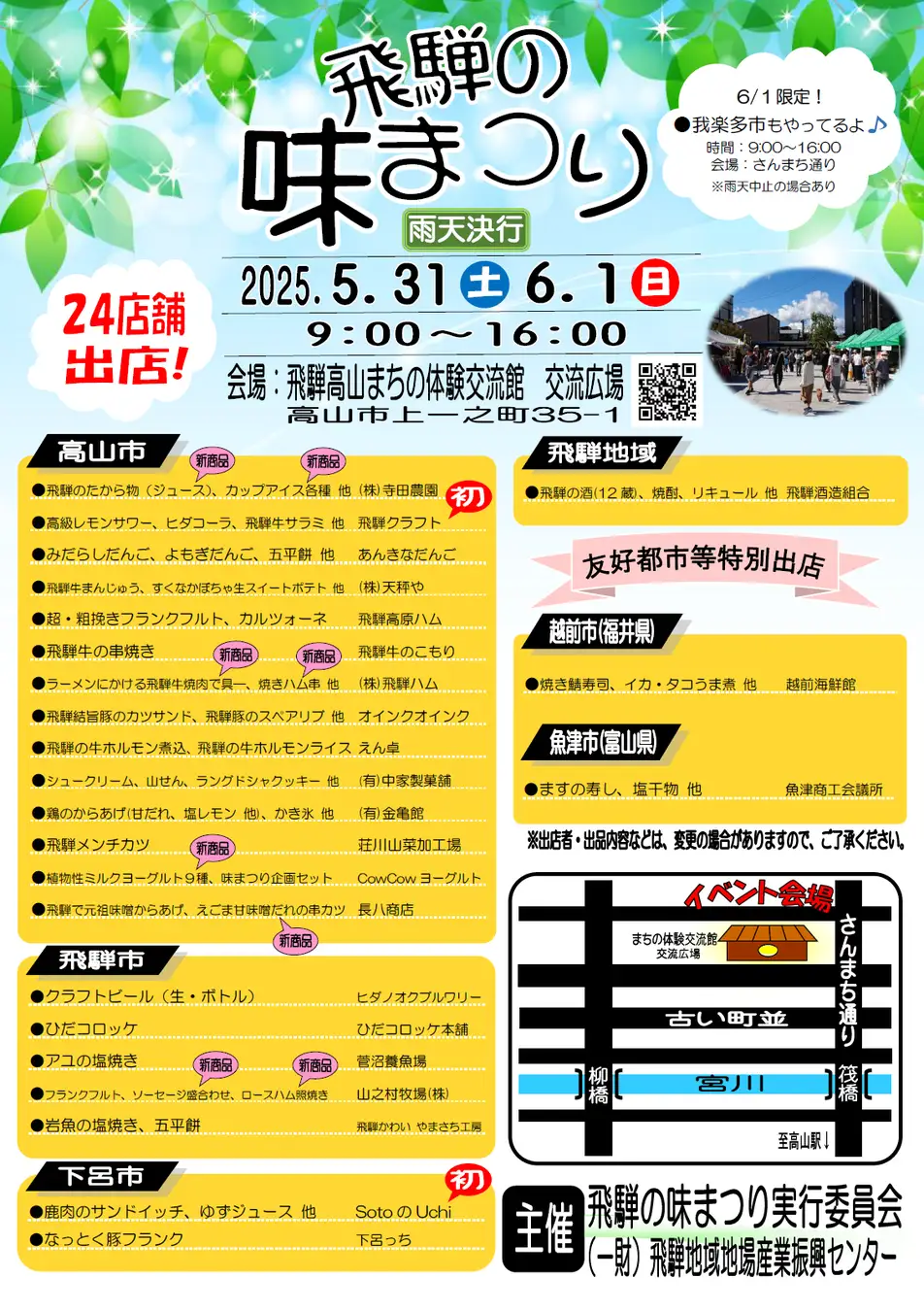 飛騨の食の魅力が一堂に会する恒例イベント「飛騨の味まつり」が、2025年5月31日(土)・6月1日(日)の2日間、飛騨高山まちの体験交流館交流広場にて開催されます。