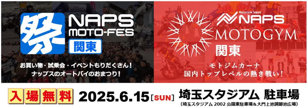 2025年6月15日(日)、埼玉スタジアム駐車場にて『2025 NAPS MOTO-FES / MOTOGYM 関東』が開催されます。“見る・買う・遊ぶ!!”をテーマに、入場無料で楽しめるコンテンツが満載のライダーズイベントです。