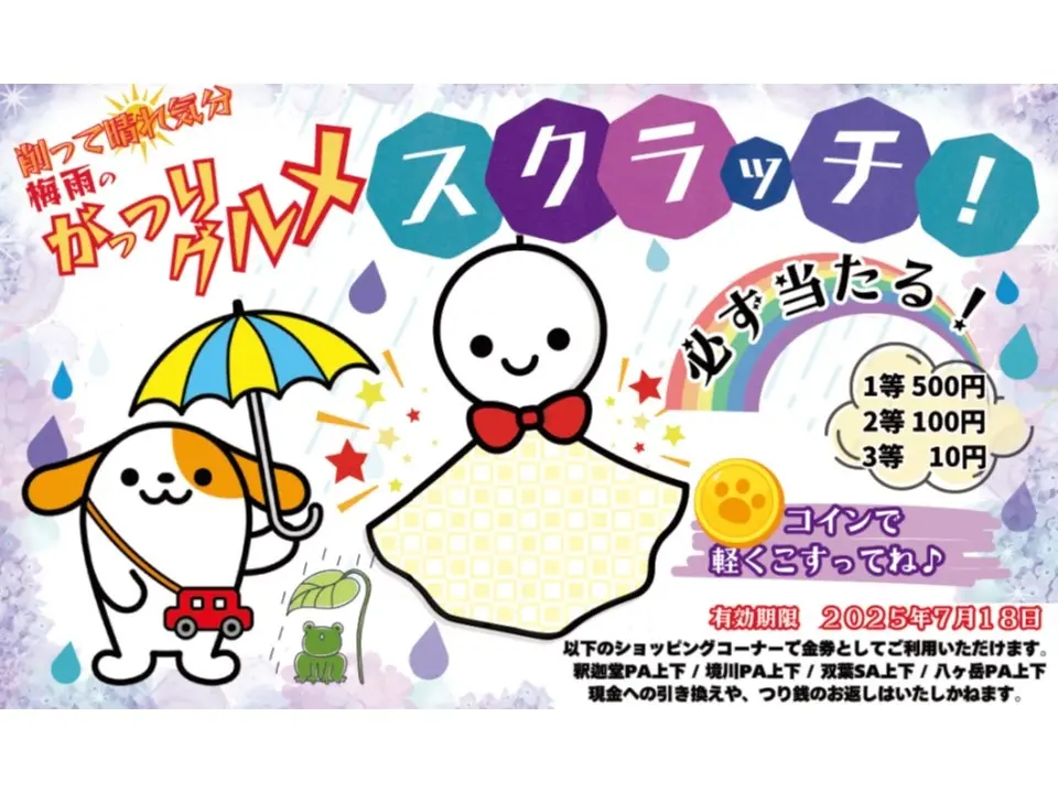 【中央道・SA/PA】必ず当たる!ジメジメ気分を吹き飛ばす「がっつりグルメスクラッチ」開催(5/30~6/30)