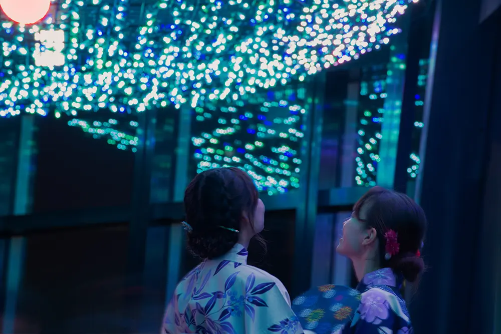 メインデッキ1階フロアの北面(皇居・丸の内方面)に広がる青く輝くイルミネーションは、まるで天の川のように幻想的。大切な人と一緒に“星空散歩”気分を味わえる、夏ならではの特別なひとときが楽しめます。