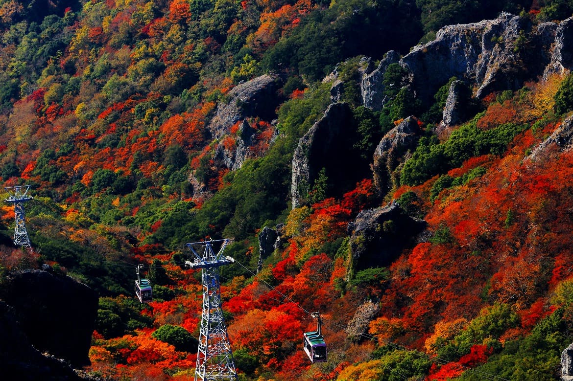 大分県の邪馬渓、群馬の妙義山と並び、“日本三大渓谷美”と称される「寒霞渓(かんかけい)」。約1300万年前の火山活動によってできた岩石が長い年月をかけて侵食され、そそりたつ奇岩怪石の渓谷美になりました。その絶景はミシュランでも1つ星を獲得しています。標高差317mを5分で登る「寒霞渓ロープウェイ」は、日本で唯一“空・海・渓谷”が同時に眺められる上、秋には真っ赤に染まる紅葉も一緒に欲張れます。寒霞渓の山頂に到着したら、名物「かわら投げ」(1組200円)で運試しを!少し離れた岩の上にある輪っかをくぐり抜ければ気分スッキリ。幸せも訪れそうです。
