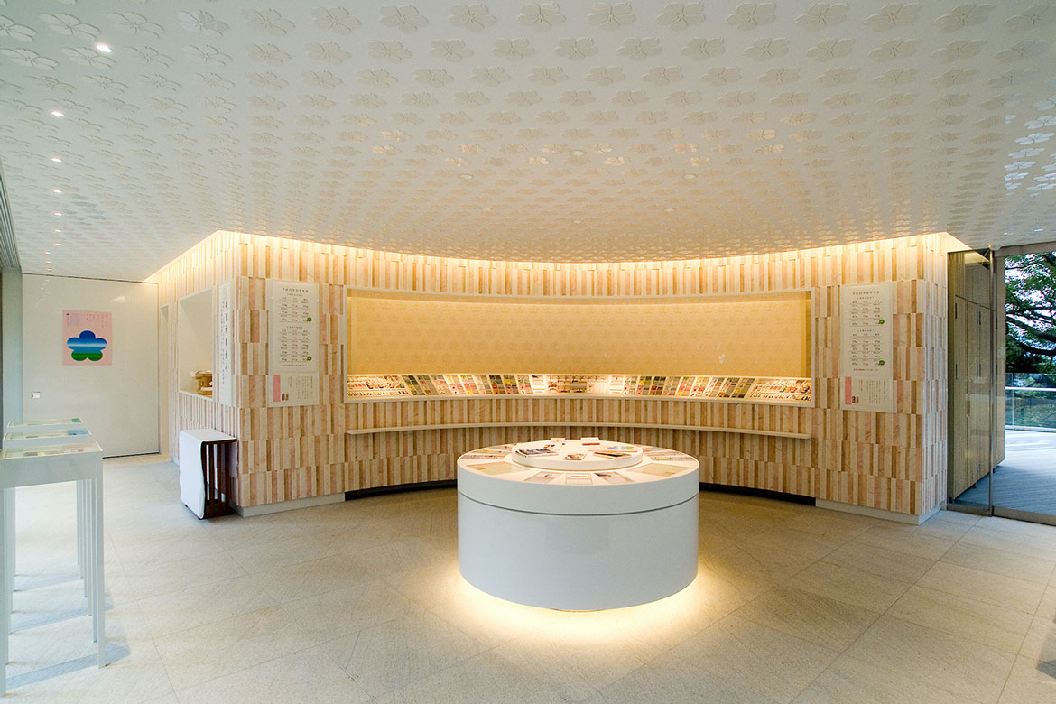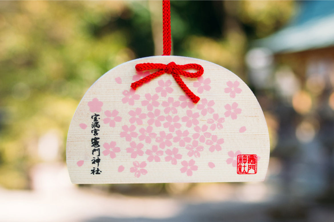 境内で人気を集める「お守り授与所」。"100年後も愛され続ける建物"をテーマに、世界的インテリアデザイナーWonderwall片山正通さんが手掛けました。ピンク色の大理石や、御神紋である桜のモチーフが散りばめられた美しいデザインに注目です。恋守りむすびの糸やいちご守りなど竈門神社ならではのお守りは、お土産にもおすすめ。建物の裏手にある太宰府が一望できる「展望舞台」にも、立ち寄ってみてください。
