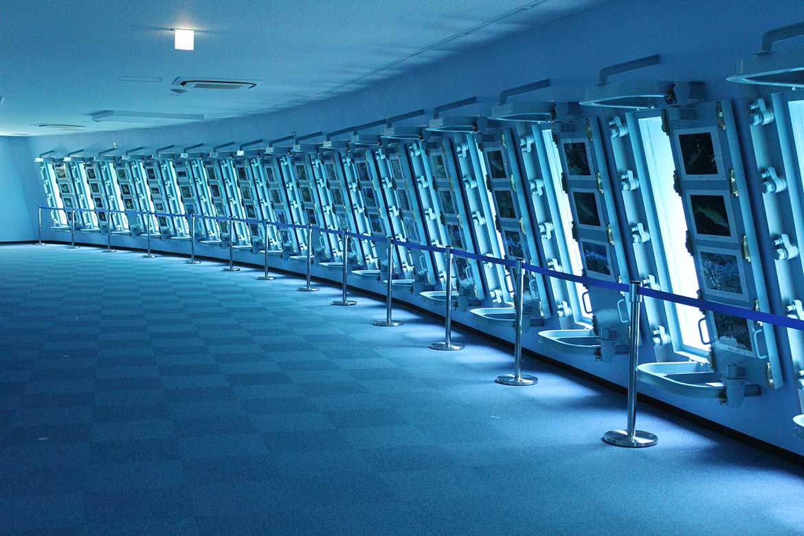 老若男女に人気の観光スポット「宮古島海中公園」。受付でチケットを購入し、階段とゴンドラに乗り「海中視察施設」へ向かうと宮古島の海中が目の前に!24個の窓から海中や魚達を間近で眺めることができます。服を着たまま海に潜ることができる新感覚なスポットをお楽しみください。