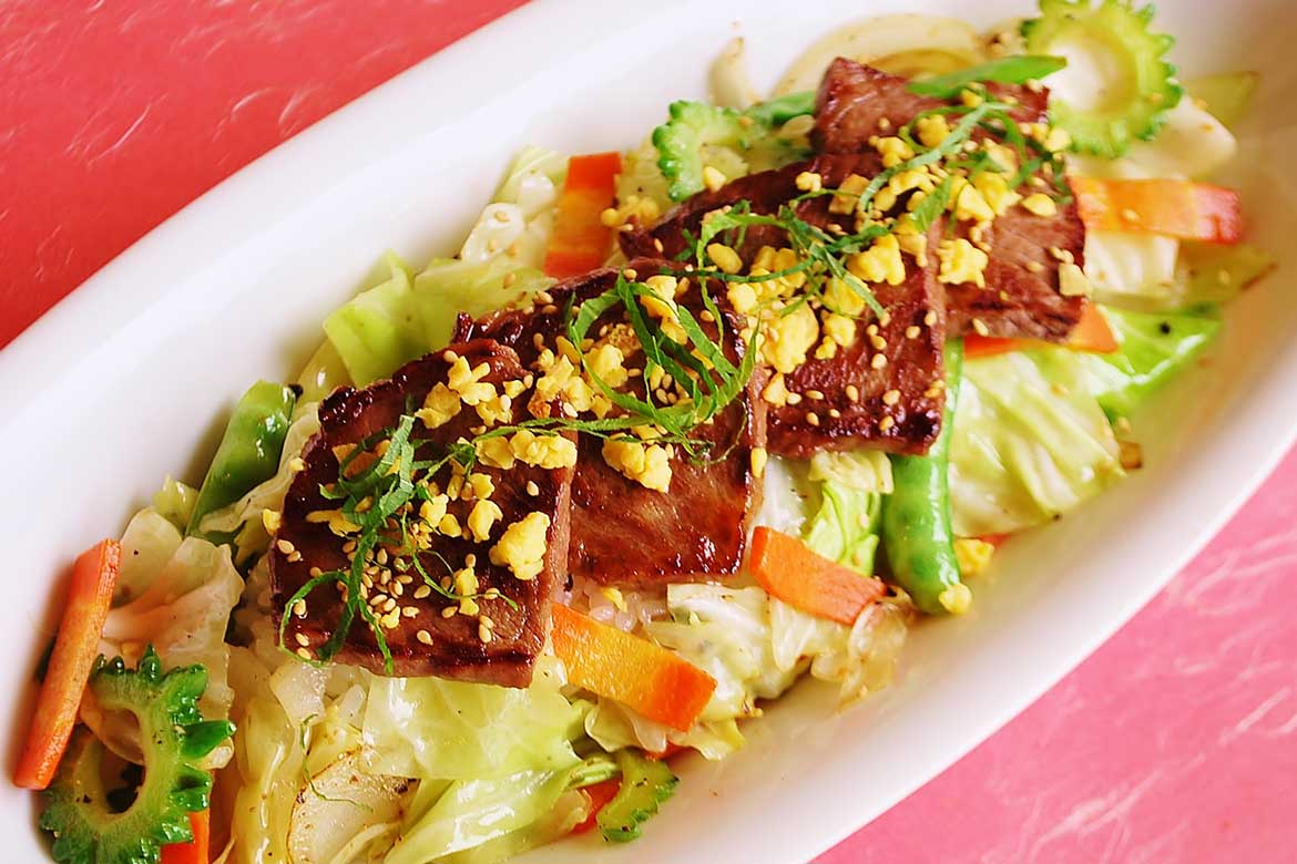 「農家れすとらん 楽園の果実」は、有機JAS認証を受けた圃場(ほじょう)を持つ農家が経営しているレストランです。メニューに使用している素材は、宮古島産のものにこだわっており、ここでしか味わえないものばかり。なかでも人気なのが「宮古島産黒毛和牛のステーキ丼(スープ・季節の前菜付き)」は、最高級ランクの宮古牛が味わえる贅沢な一品。ぜひ店頭でご賞味あれ!(※季節によって盛り付けの野菜は異なります)