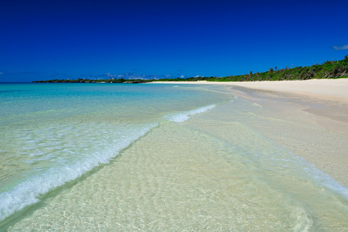 伊良部島のなかでも人気が高いビーチ「渡口の浜」。弓状の形をしており、サラサラの砂浜は思わず裸足で駆け出したくなる気持ちよさ。海水浴やマリンビーチ、周辺には食堂もあるのでのんびりとビーチを満喫することができます。宮古島本島から高速船やフェリーで訪れることができ、宮古島に来たら少し足を伸ばしてでも行く価値のあるビーチです。