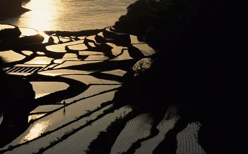 浜野浦海岸に流れ込む約2kmの浜野浦川によって形成された浸食谷に、堂々と築かれてきた棚田。自然の描くカーブにそって、大きさも形も地形に合わせて造形されてきた棚田は、「千枚田」「段々畑」などと呼ばれ、稲作が始まった時代から続く風景だ。海岸から駆け上がる階段のように、面積11.5haの中に大小283枚の田んぼが幾重にも連なる。農林省主催の「日本の棚田百選」に選定。